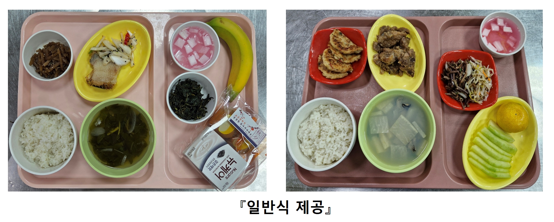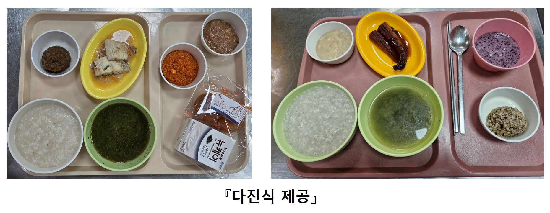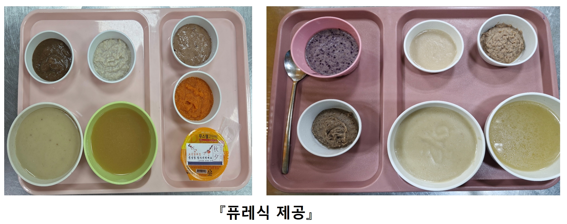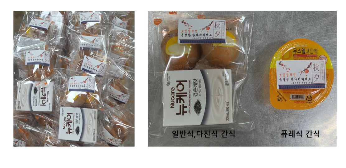 일반식과 다진식을 드시는 어르신들에게는 부드러운 만주와 영양음료를, 퓨레식을 드시는 어르신들에게는 삼키기